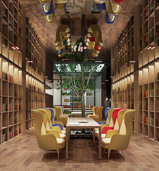 书店与咖啡馆的结合司空见惯,不过,当归本主义不拘一格的书店设计与天马行空的创意碰撞在一起时, 带给人的期待值远远超过了1+1大于2的效果。空间内简洁的线条和强烈的色调对比,配合不落俗套的挂饰和家具 ,把酷和帅气全面的呈现出来,给人耳目一新的感觉。面积绿植的运用,自然气息浓郁,原木书架或沿墙而置, 或嵌于墙上,或自吊顶垂落而下,在空间延展开来,浪漫悠闲的空间里散发着淡淡的书香气息,让人心旷神怡。 锈铁与混凝土地面使空间色调趋于宁静,为顾客营造出一个安逸、平和的港湾。整个空间的陈设繁多却不拥挤, 随手拿起一本书,就着暖暖的阳光,一杯咖啡,组成最惬意的生活。