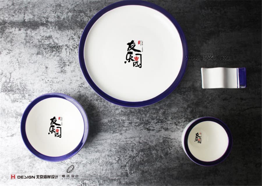 初看到餐具的时候就被他深深的吸引,蓝色边框镶于圆盘四周,友乐园三字浮于圆盘中心,天圆地方这四个字顿时出现在我的心头,反佛这一个个圆盘化成了一间间充满欢声笑语的园子,邀三五知己 ,享一园美食 。生活也不过如此吧!